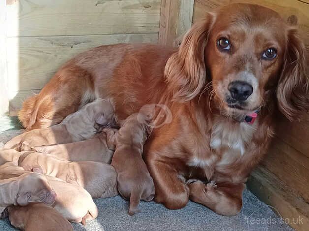 Mum is a KC registered red cocker spaniel she carries the golden gene, she is very gentle and loving dog brilliant with other animals and children she will be seen with pups.